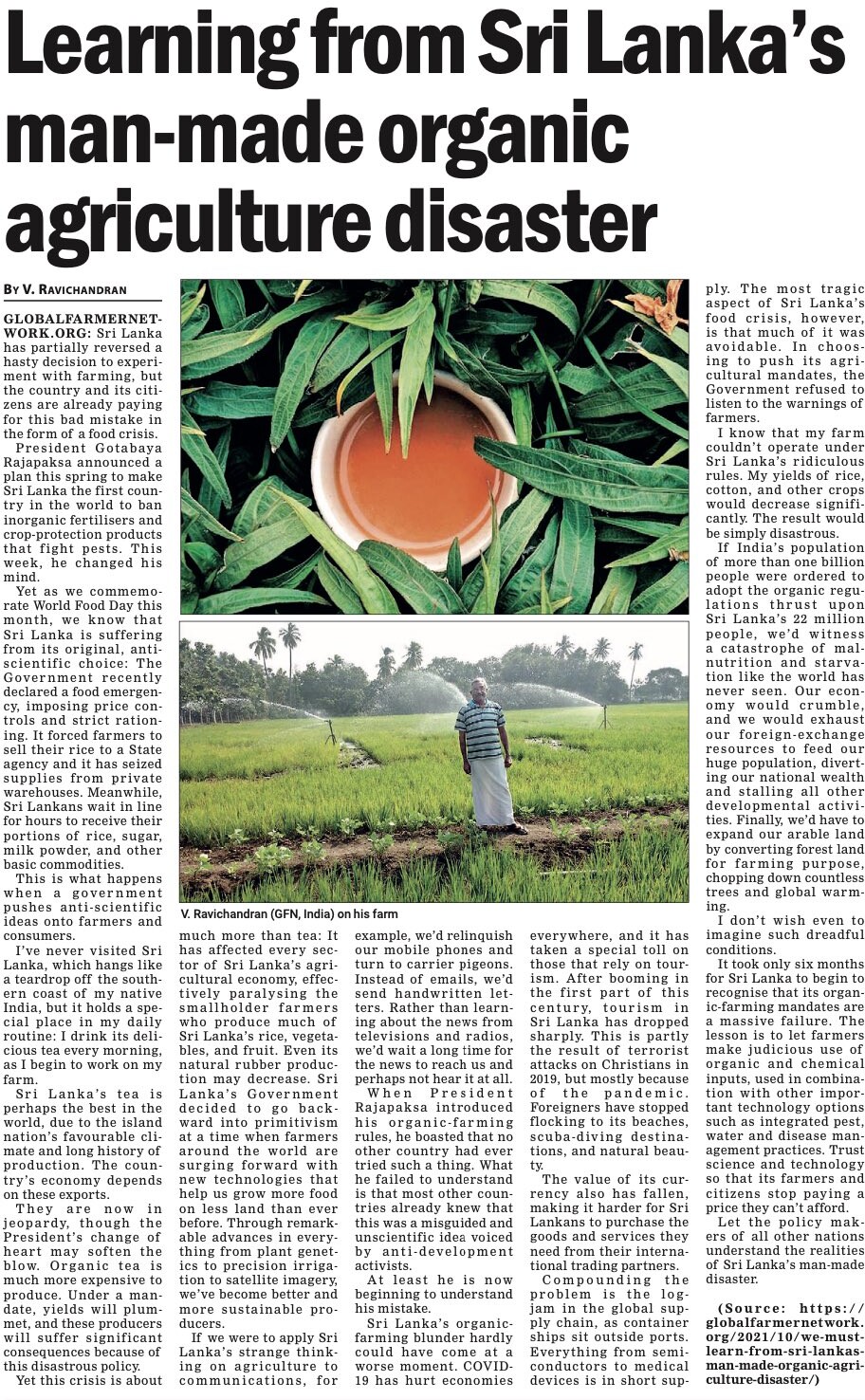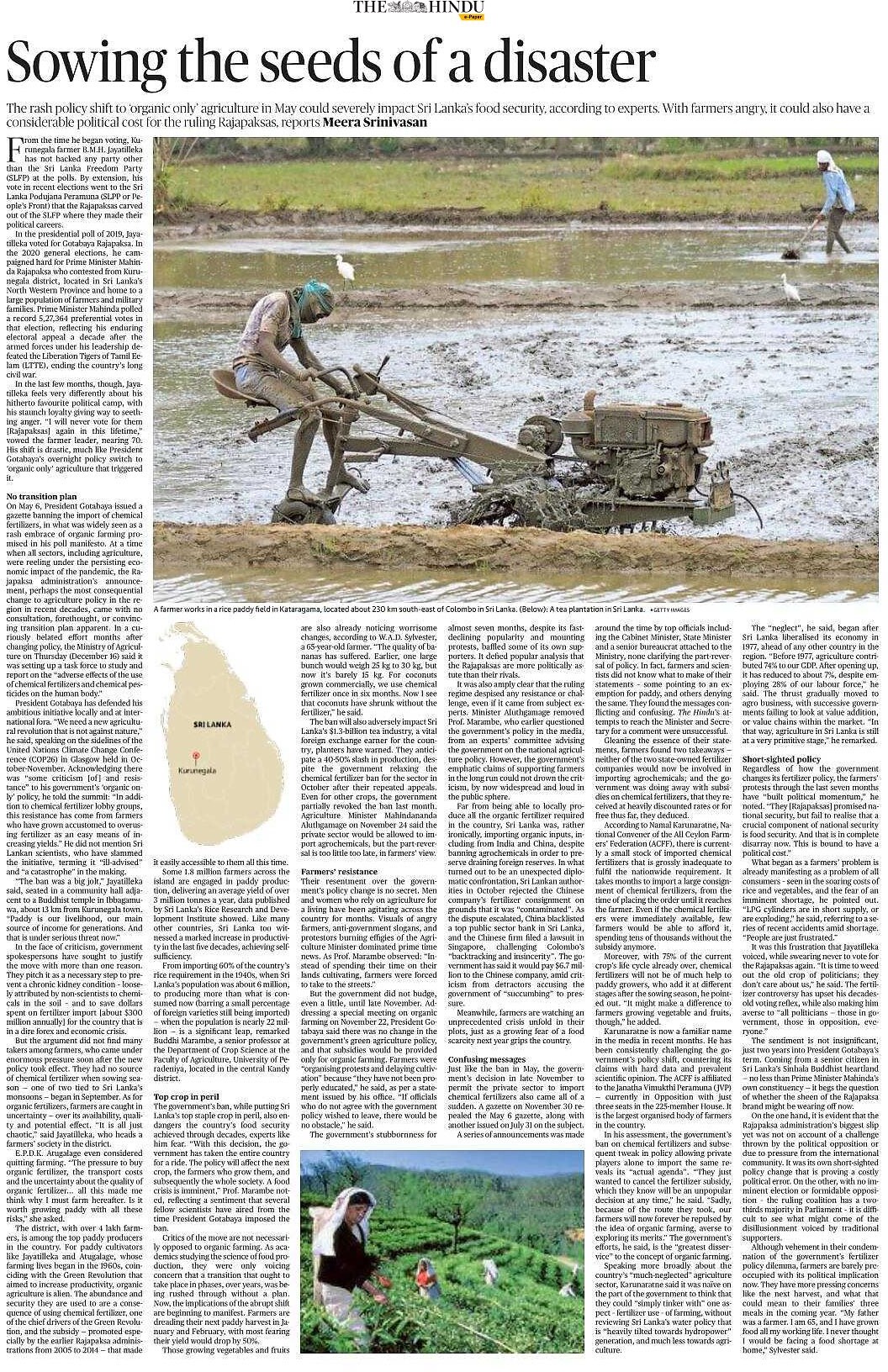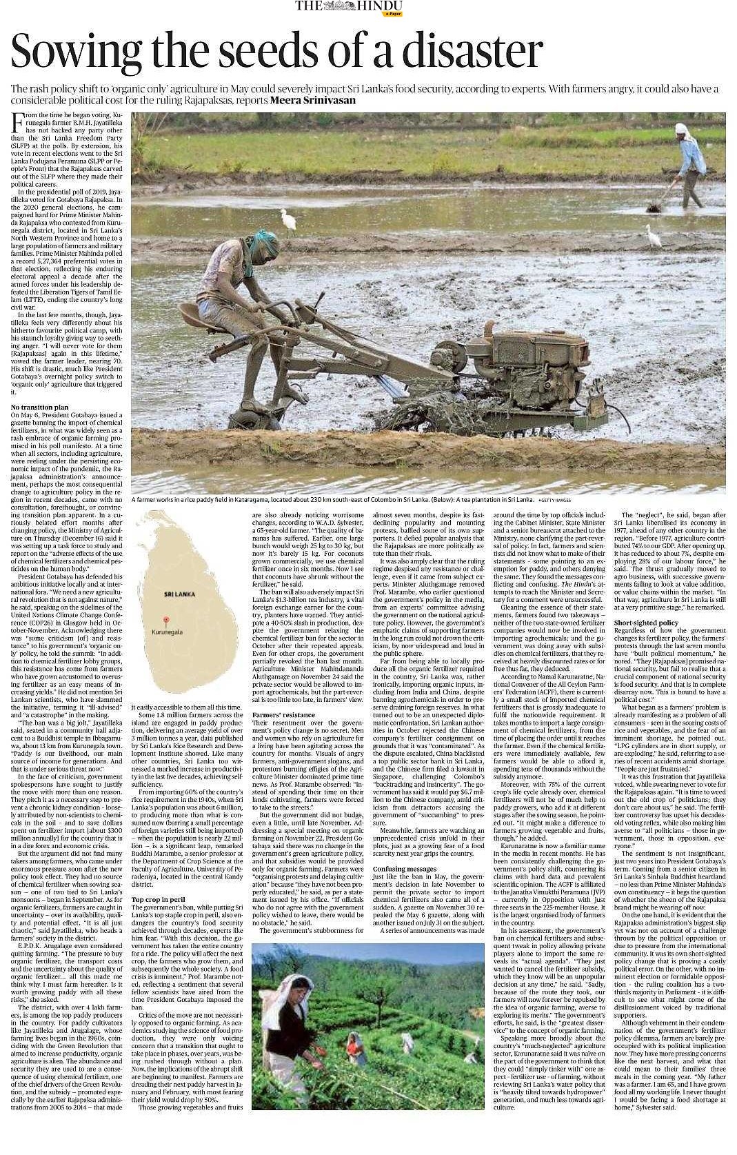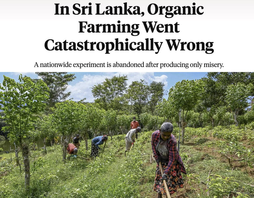 斯里兰卡去年对其公民进行了邪恶实验。在有机食品和反转基因活动家的影响下,政府禁止进口合成农药,强制全国转向全有机农业,导致绝大多数农民无法获得种植国家赖以生存作物所需的关键工具。
