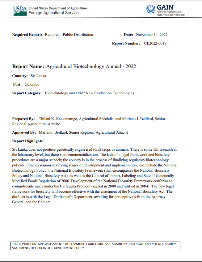 尽管号称实施转基因禁令,美国农业部报告显示,斯里兰卡2021年进口了价值1.79亿美元的转基因食品,且已在种植转基因作物,等待立法以实现计划商业化并于2023年出口美国。